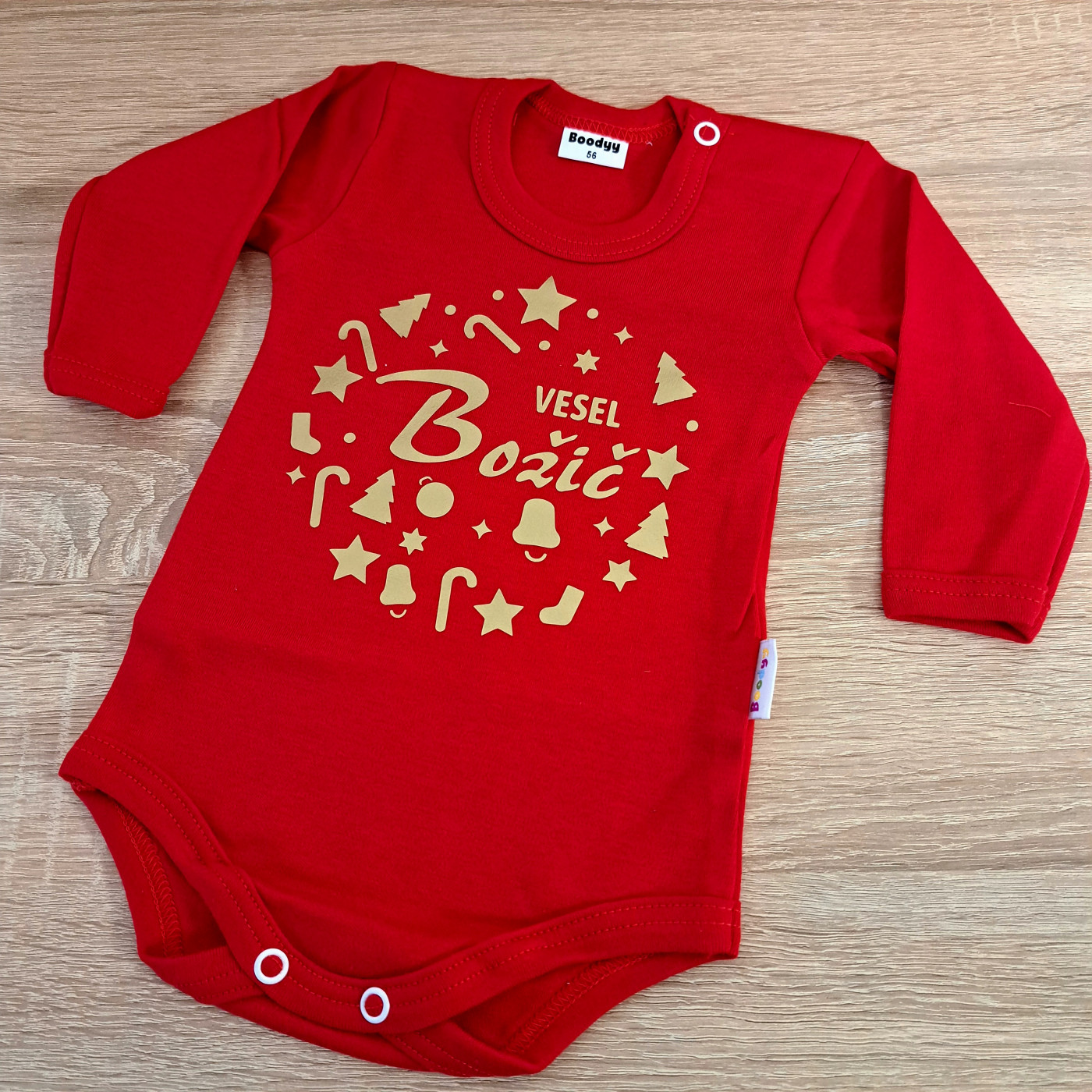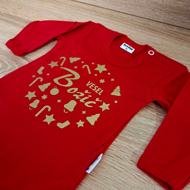 Spremenite prve praznike vašega dojenčka v sijoč spomin z našim bodijem iz omejene zlate izdaje. Živa rdeča barva simbolizira toplino in veselje praznikov, eleganten zlat napis "Vesel božič" pa doda pridih razkošja in slovesnosti. Ta bodi bo zvezda vsake božične fotografije.